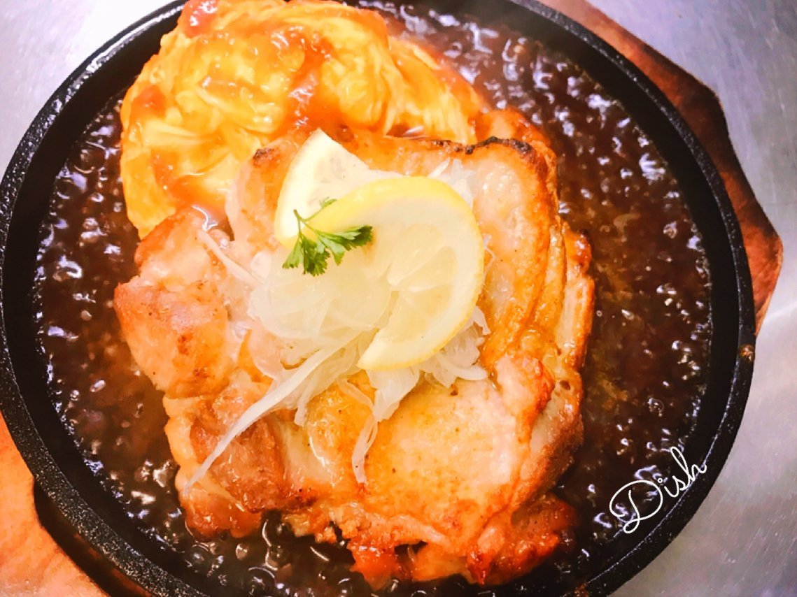 チキンレモンステーキのオムライスは熱々鉄板で提供するわさだのオムライス!\(//∇//)\