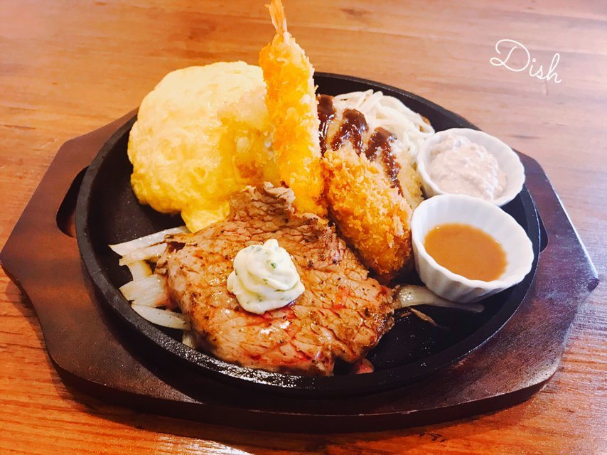 洋食屋さんらしいおとな様ランチ開発ちゅーです!ステーキもエビフライもカキフライもついてるすてきなオムライスです!\(//∇//)\