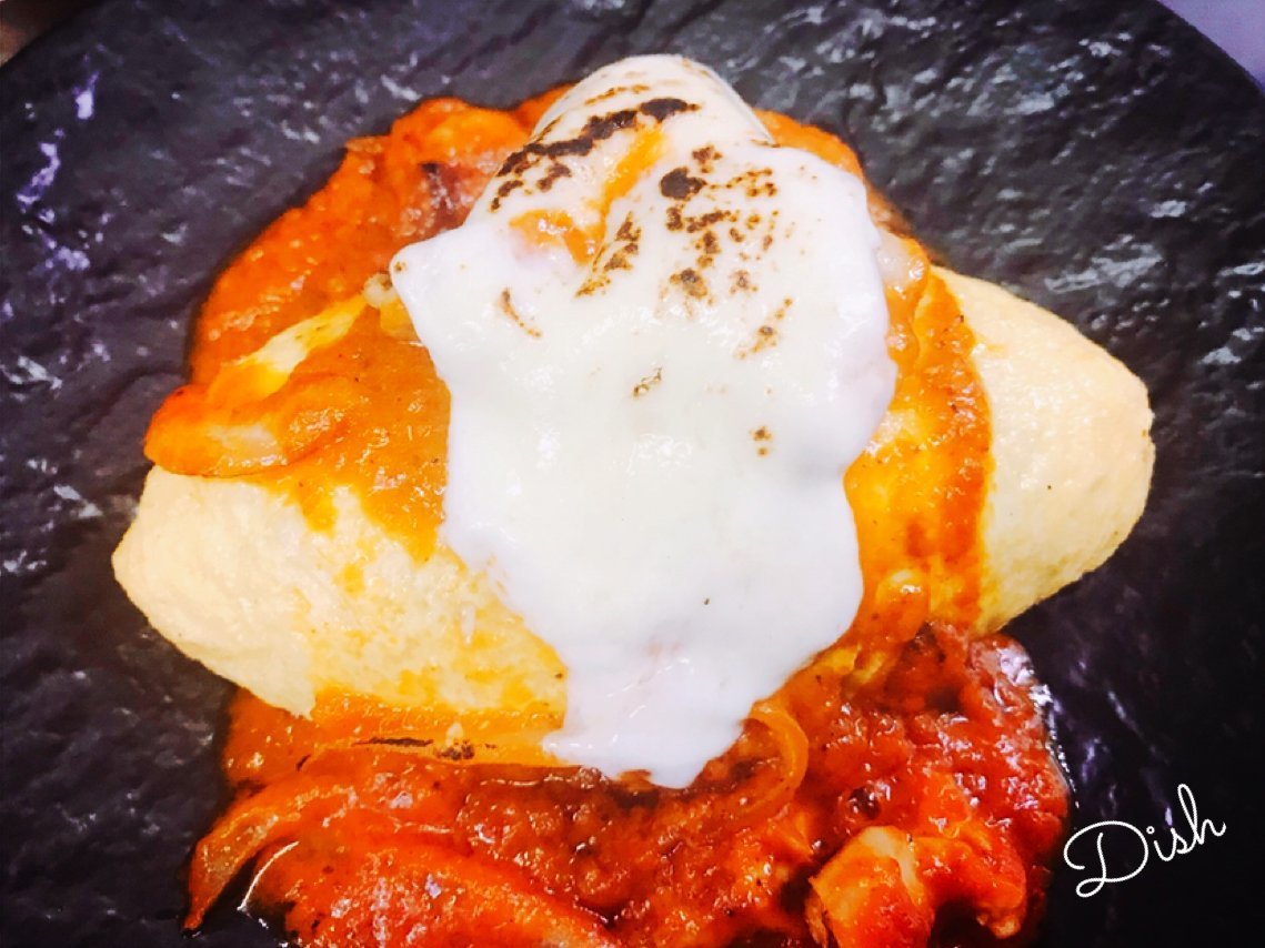 モッツアレラチーズのチキントマトオムライスはとろーりチーズがおいしーわさだのオムライス\(//∇//)\