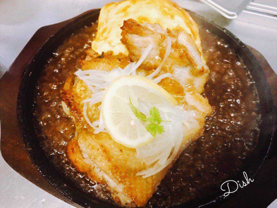 チキンレモンステーキはパリッとした皮目がおいしーわさだのオムライス!熱々鉄板で食べて明日からのお仕事に備えちゃおー!\(//∇//)\
