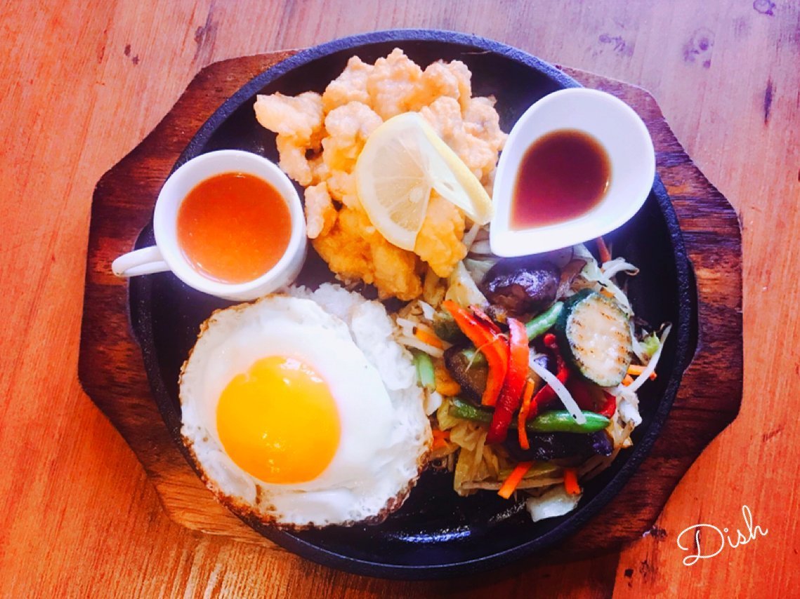 近日公開!とり天とたっぷり野菜の鉄板プレート!ごはんの上に目玉焼きがのってるのがオムライス屋さんの矜持!ー\(//∇//)\わさだ店で近々デビュー!