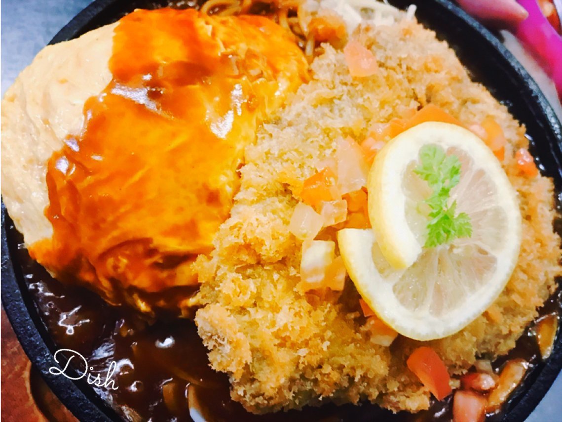 ビーフカツのトルコオムライスはスパゲティも熱々鉄板についてる洋食屋さんなわさだのオムライス\(//∇//)\
