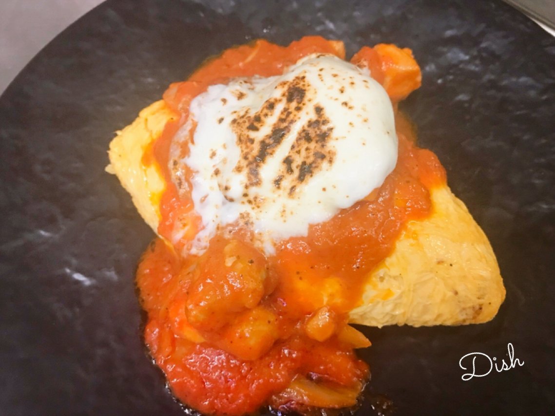 モッツアレラチーズのチキントマトオムライスはとろーりチーズのわさだのオムライス\(//∇//)\
