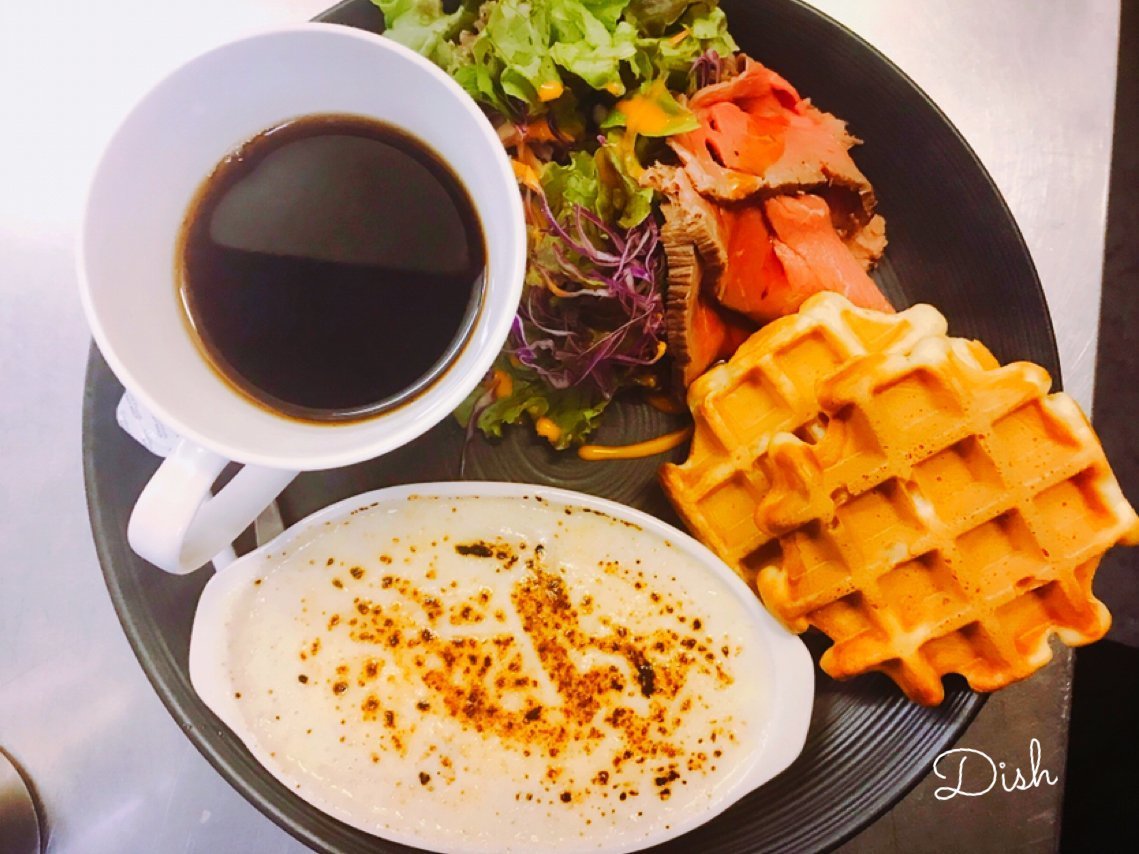 ワッフルとローストビーフサラダにグラタンのワンプレートはちょっと軽めのお食事したい方に大人気なわさだのメニュー\(//∇//)\