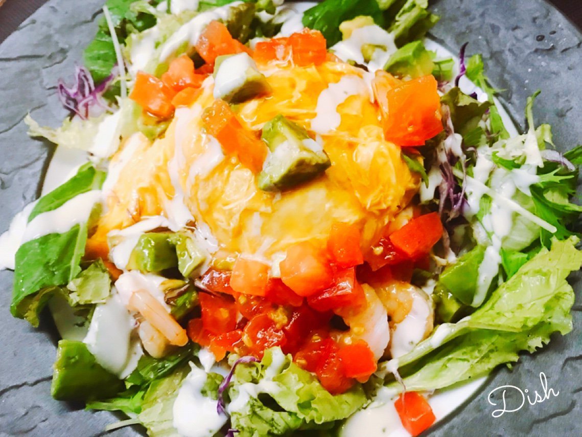 エビとアボカドのサラダオムライスはお野菜たっぷり!わさだのオムライスです!\(//∇//)\