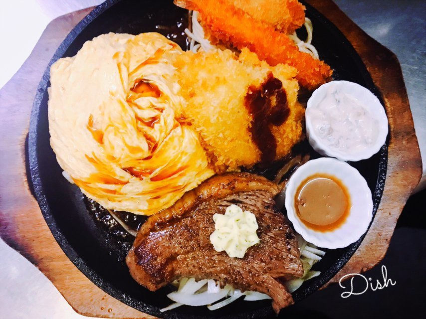ミニステーキにエビフライにカキフライにチキンカツ!大人のお子さまランチはわさだの鉄板オムライス!\(//∇//)\