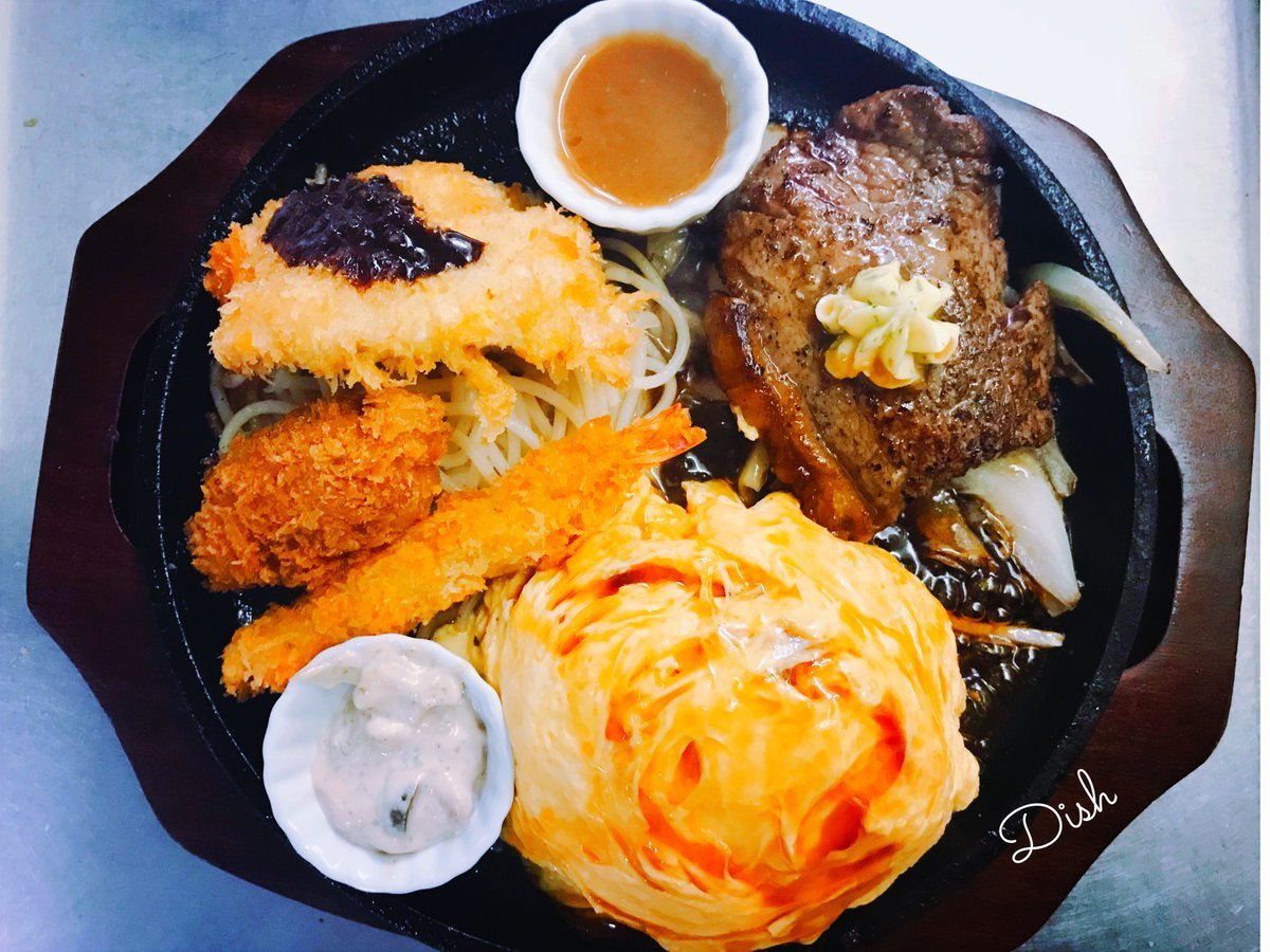 ミニステーキにチキンカツにエビフライにカキフライ!洋食てんこ盛りな大人のオムライスはわさだのメニュー\(//∇//)\