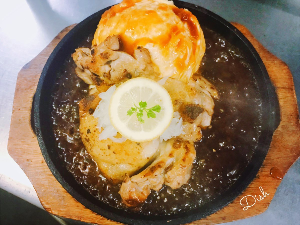 チキンレモンステーキのオムライスは熱々鉄板がおいしーわさだのオムライス!ただいま平日小学生以下のお客様半額です!\(//∇//)\