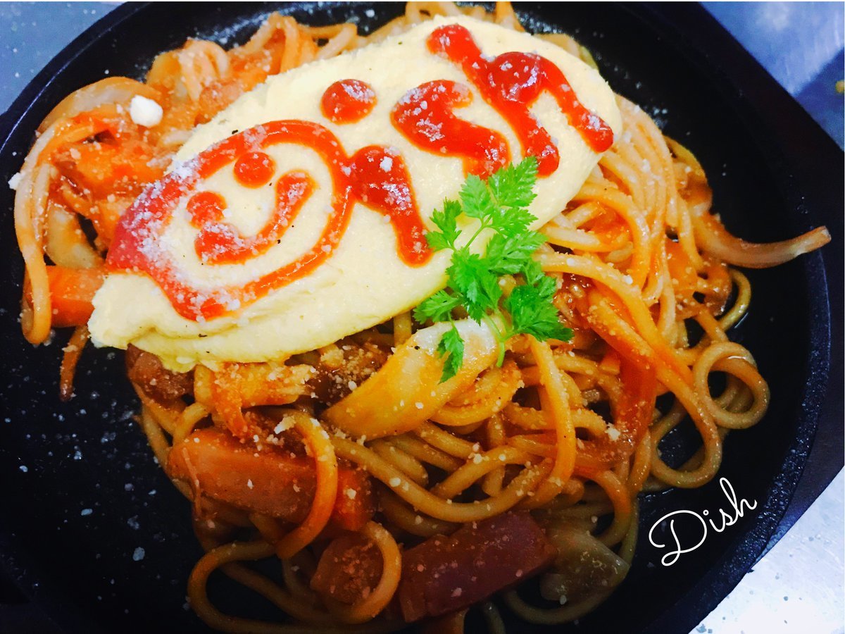 ナポリタンは特別に取り寄せたもっちりした太麺にオムライス屋さんらしくオムレツ載せてさらに鉄板!癖になる人多数なわさだの人気メニュー!\(//∇//)\
