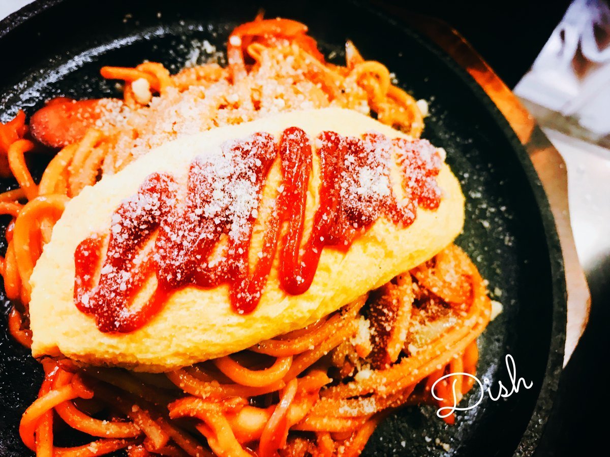 鉄板ナポリタンは特製太麺を使用したリピ確定なわさだの人気メニュー!オムレツがかわいい\(//∇//)\
