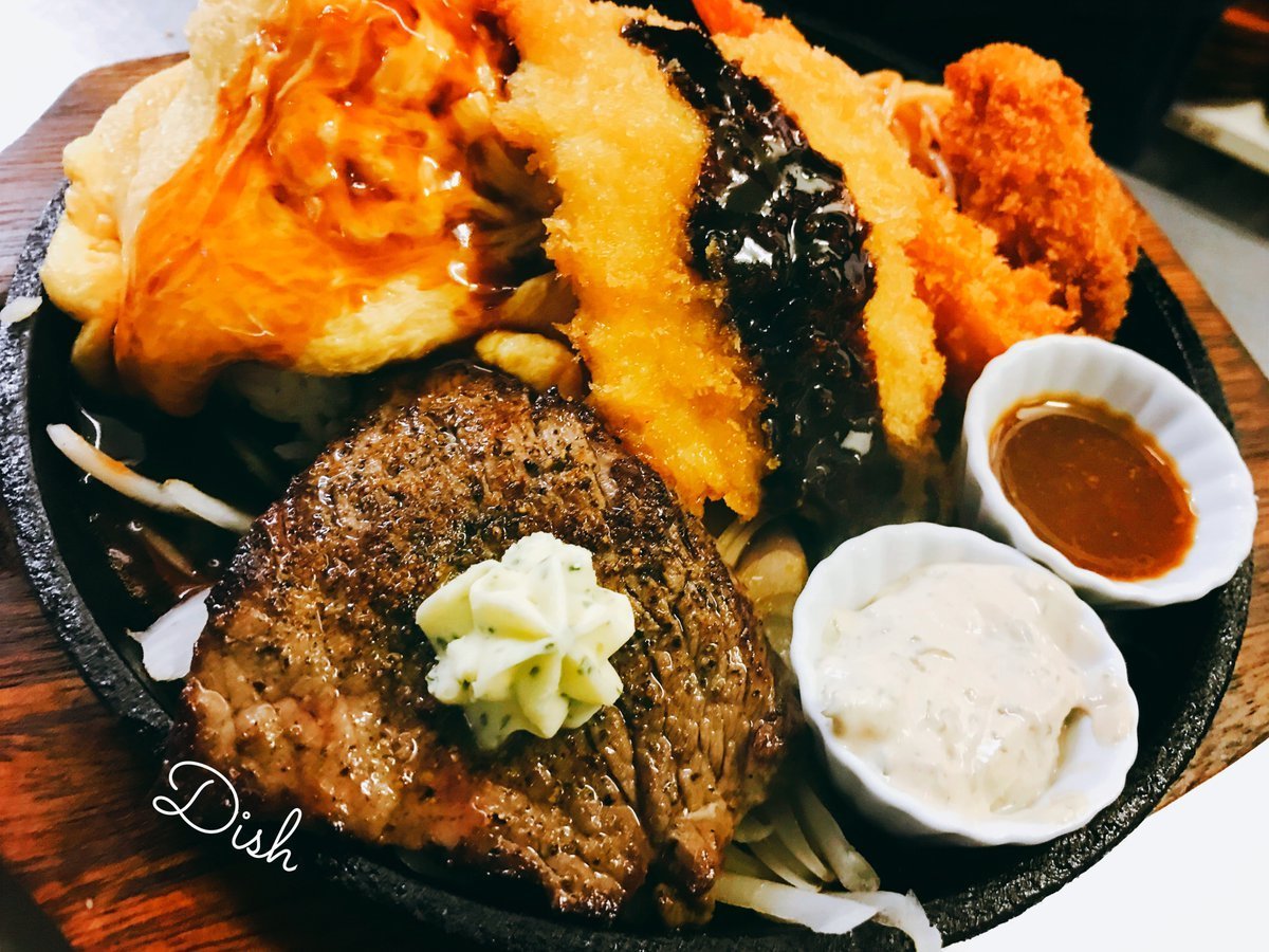 大人のお子様ランチはミニステーキにエビフライにカキフライにチキンカツといろいろてんこ盛りのわさだオムライス\(//∇//)\