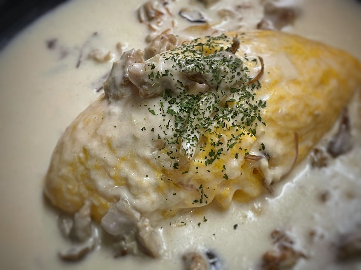 チキンクリームはいつも優しい味のオムライスです!\(//∇//)\