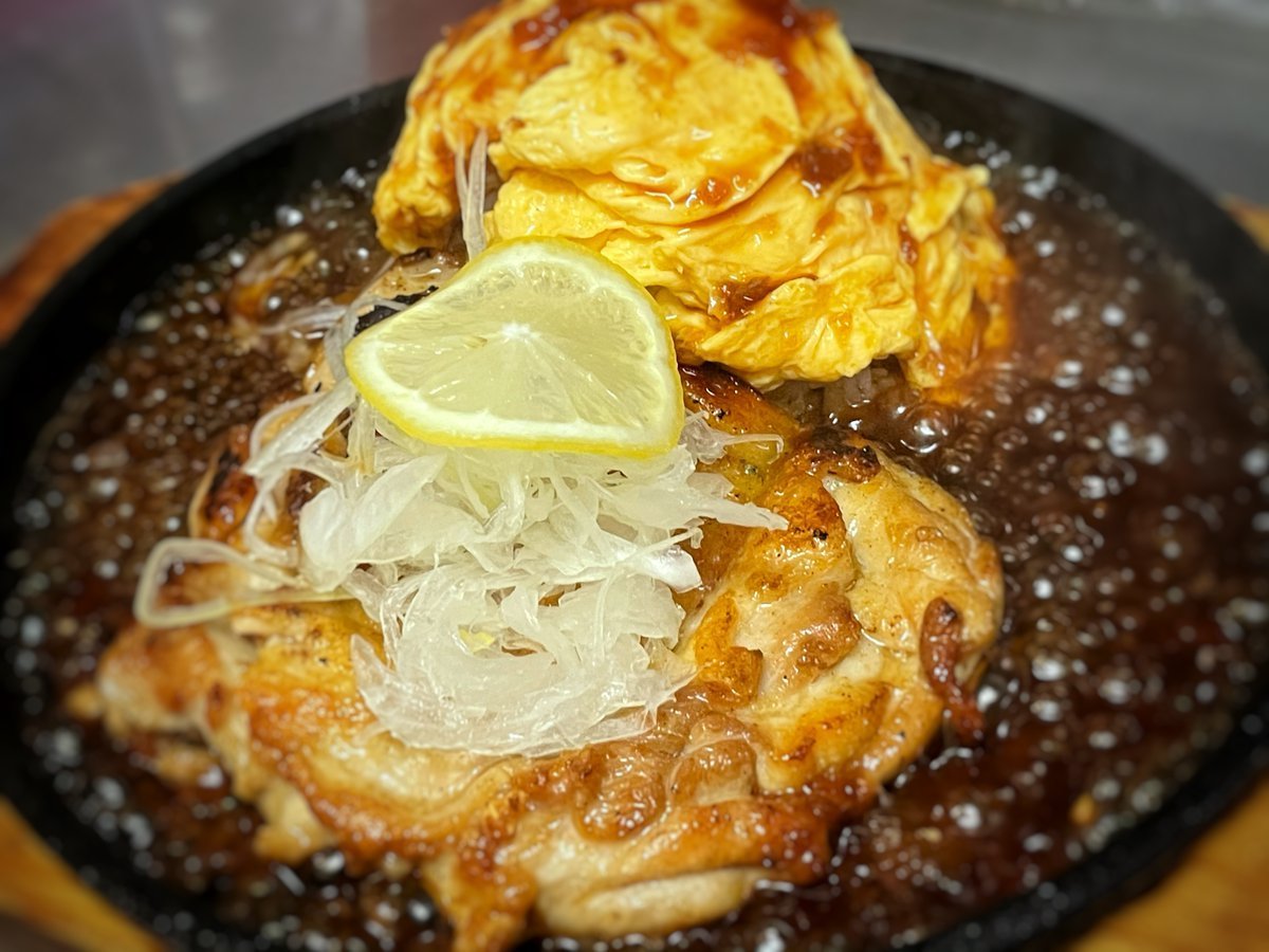 チキンレモンステーキのオムライスは熱々鉄板で供されるわさだのオムライス\(//∇//)\