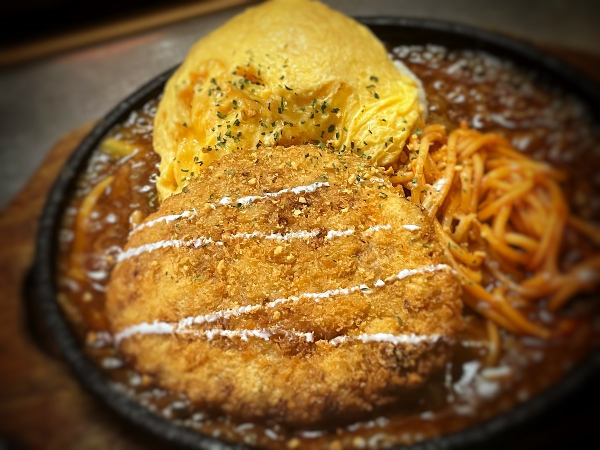 熱々鉄板で供されるメンチカツオムライスはわさだのガッツリ系オムライス\(//∇//)\