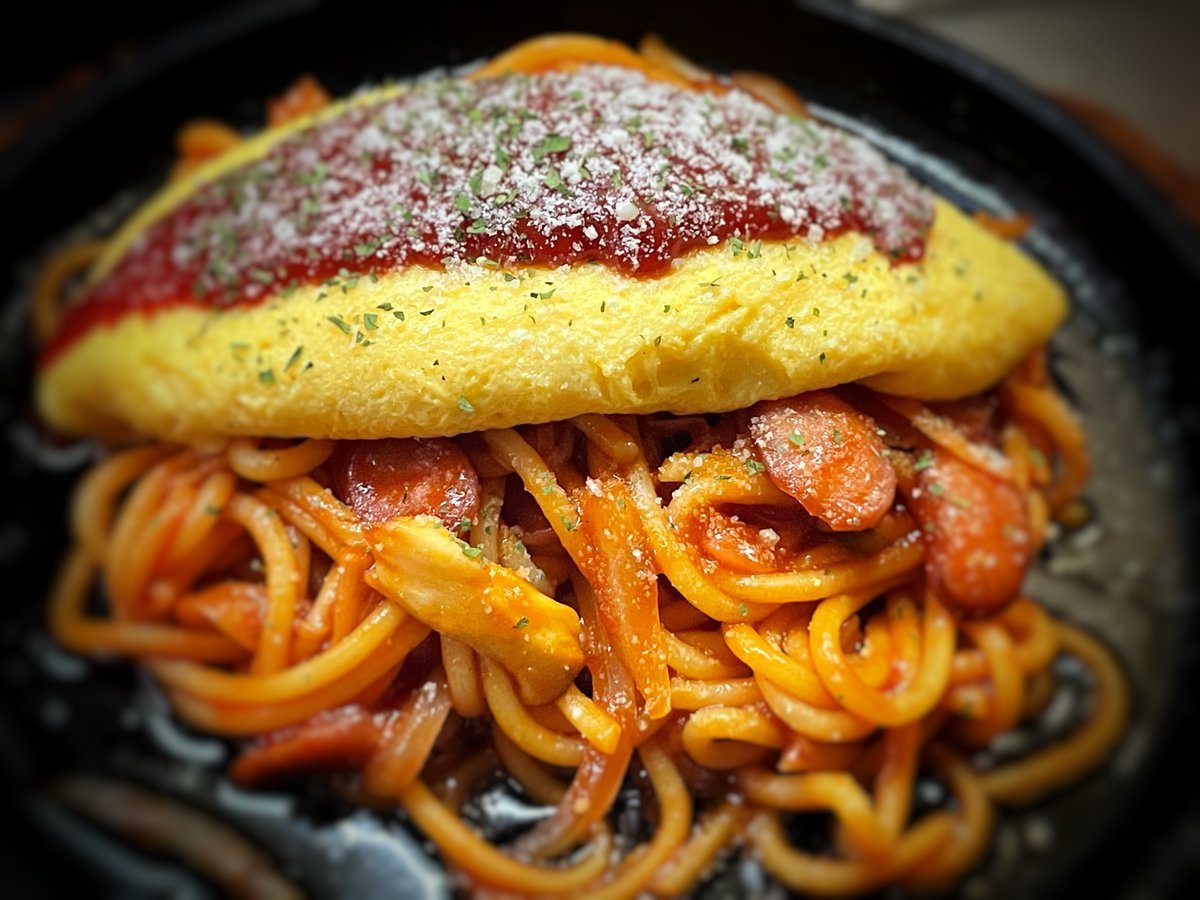 オムレツ乗った鉄板ナポリタン!太麺めちゃ旨!わさだのメニューです!\(//∇//)\
