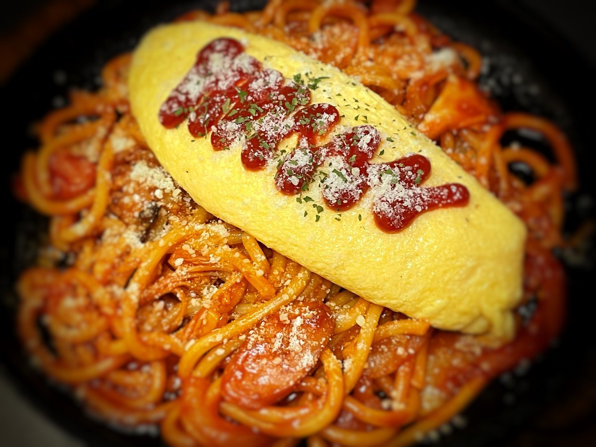 オムレツ乗った鉄板ナポリタンは太麺熱々大人気なわさだのメニュー\(//∇//)\