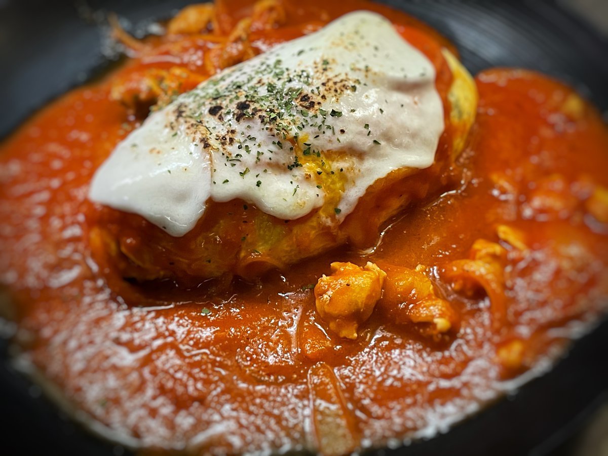 モッツアレラチーズのチキントマトオムライスはのびーるチーズがめちゃうまです\(//∇//)\