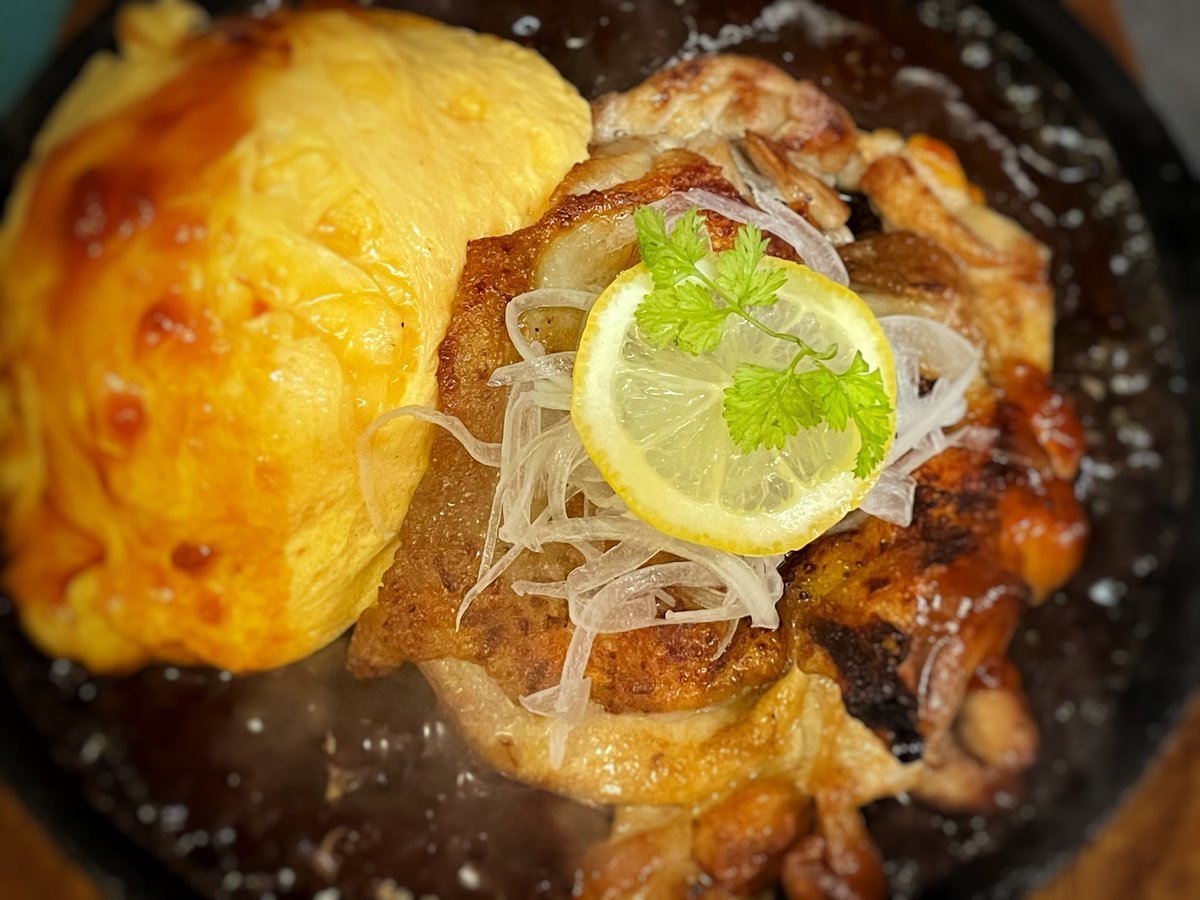 チキンレモンステーキのオムライスはカリカリな皮がおいしーわさだの鉄板オムライス\(//∇//)\