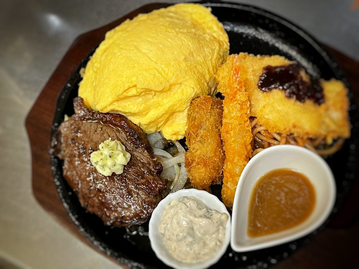 大人のお子様ランチはミニステーキにエビフライにカキフライにチキンカツ!いろいろのってるわさだの鉄板メニューです!\(//∇//)\