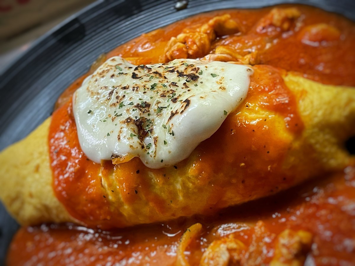 モッツアレラチーズがのびーる!トマトチキンのオムライスはチーズ大好きな方におすすめ!\(//∇//)\