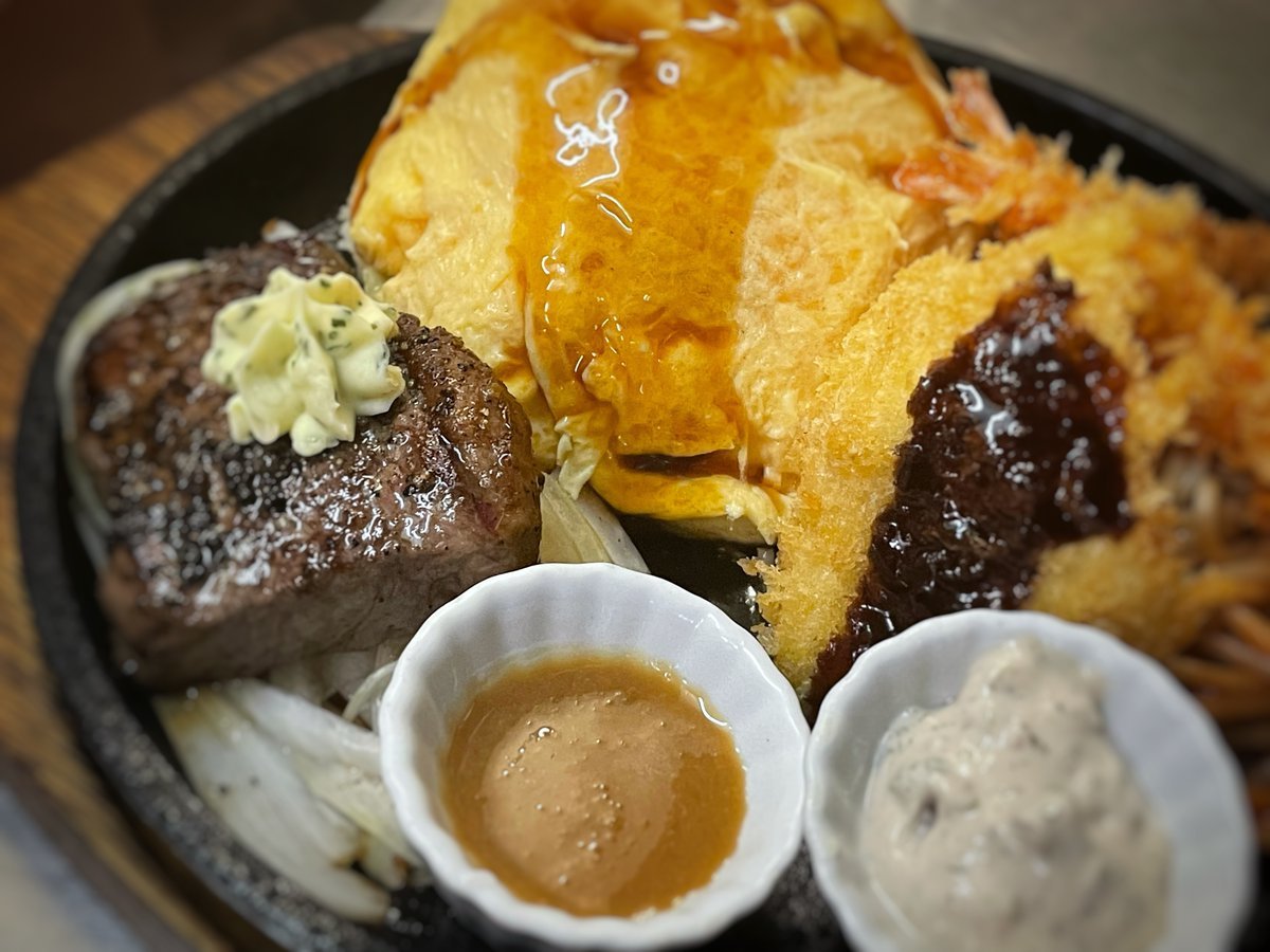 大人のお子様ランチはミニステーキにエビフライにカキフライにチキンカツとてんこ盛り!わさだの楽しーオムライス\(//∇//)\