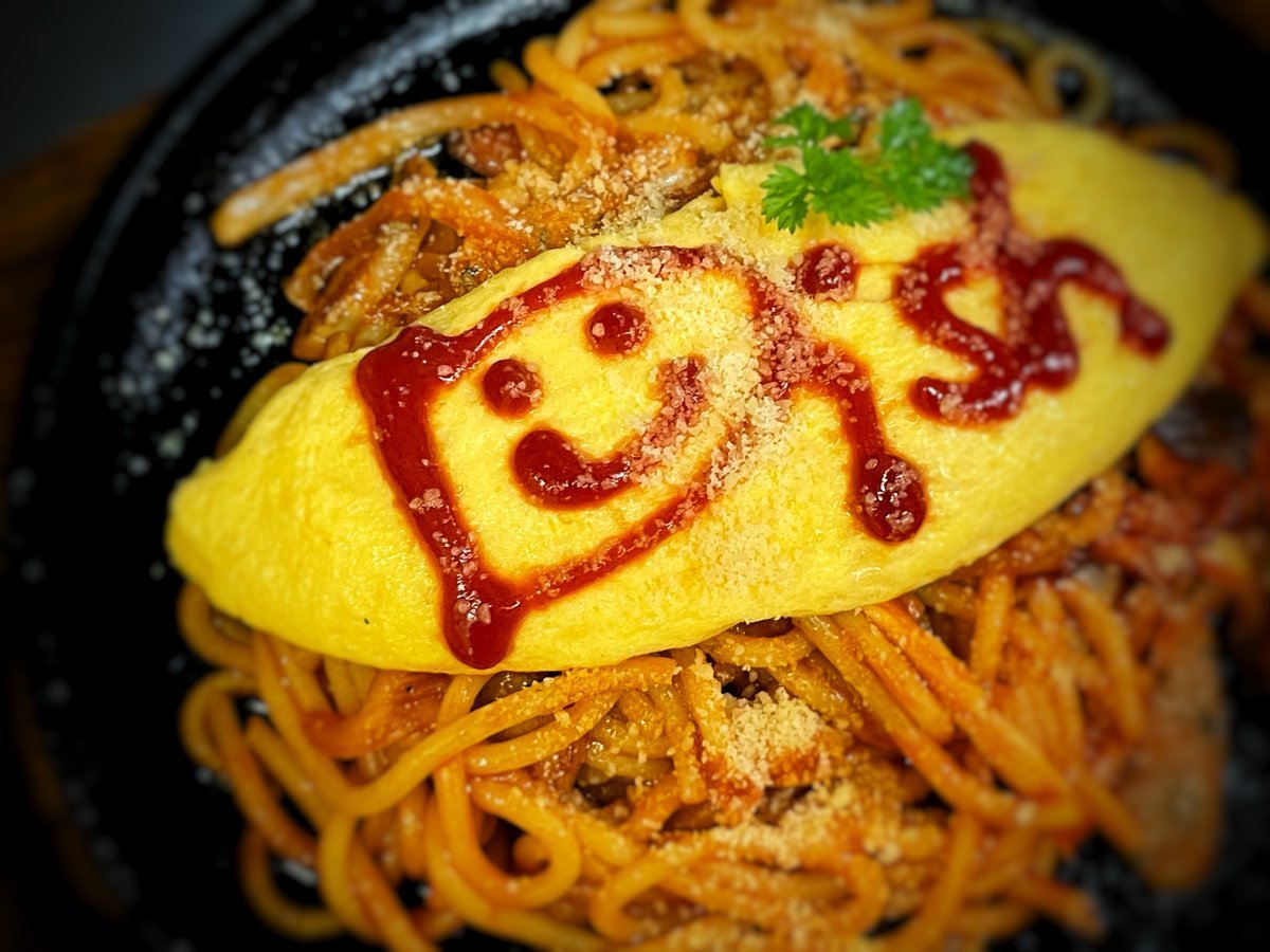 オムレツ乗ったナポリタンは鉄板熱々!わさだの人気メニュー!\(//∇//)\