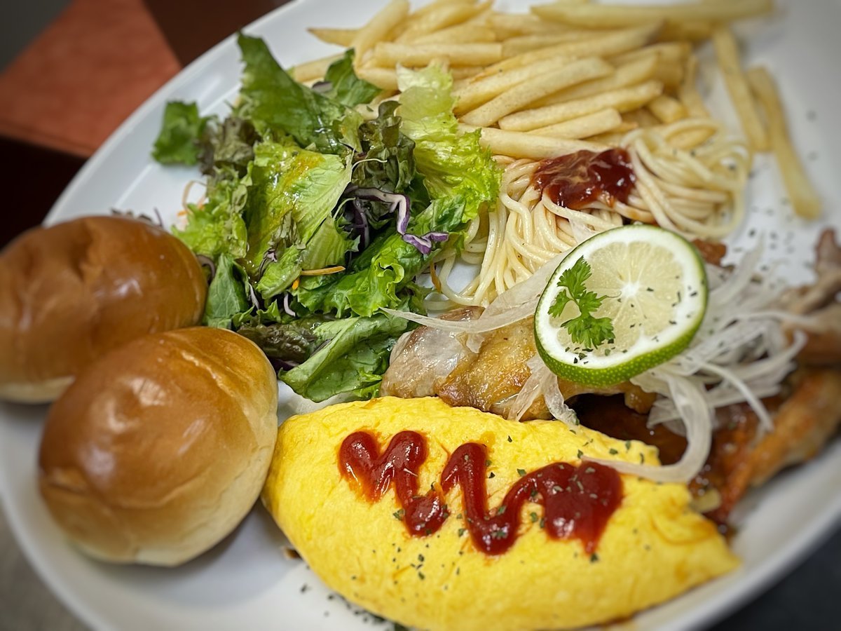 オムレツにチキンレモンにパンといろいろ乗ったワンプレート!ワンプレートと言えばわさだ店です!\(//∇//)\
