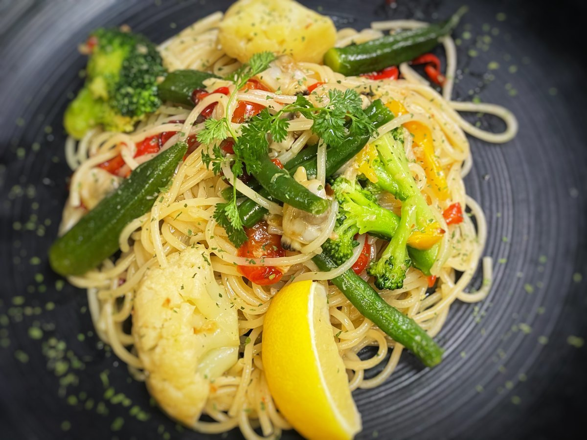 レモンを搾ると味変しちゃう彩り野菜のペペロンチーノパスタ!わさだ店の新メニューです!パスタはいいですね!\(//∇//)\