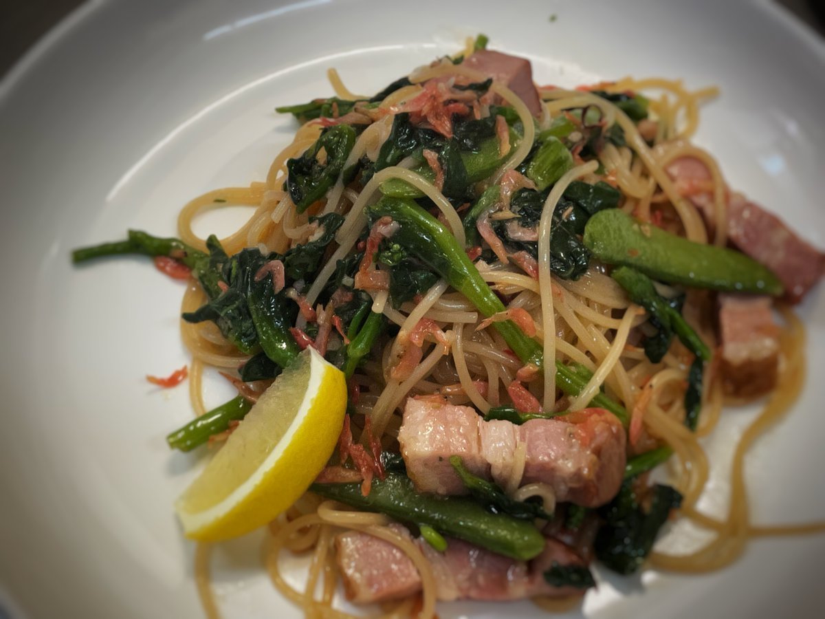 菜の花とスナップエンドウ干しエビパスタはわさだの春限定パスタ!\(//∇//)\
