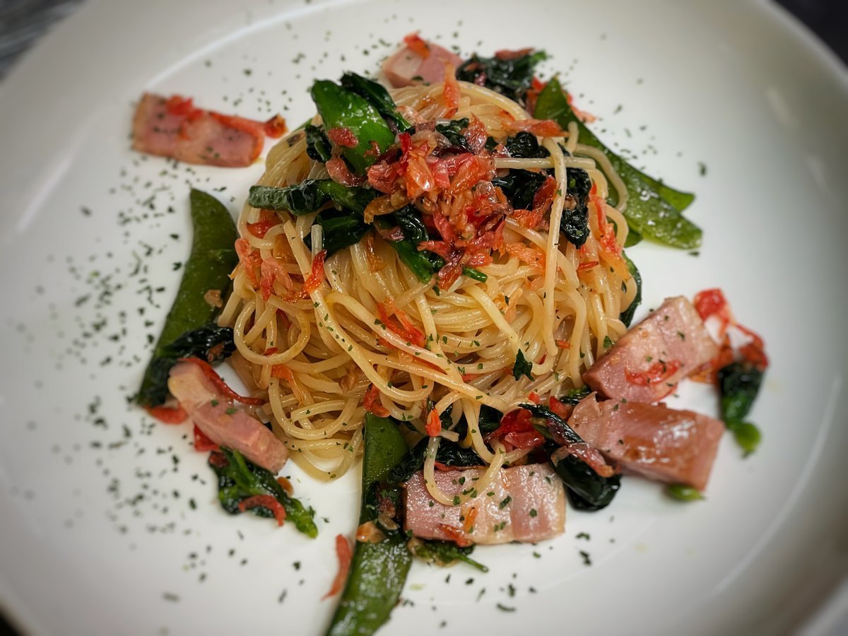 菜の花とスナップエンドウとベーコンの干しエビパスタは干しエビの旨味がめちゃうまのわさだの春限定パスタ!\(//∇//)\