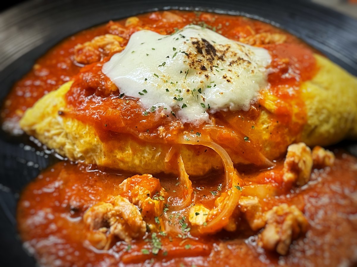 モッツアレラチーズがのびーる!チキントマトのオムライスはチーズ好きにはたまりません!\(//∇//)\