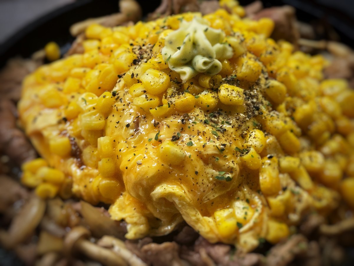 コーンたっぷり!ペッパービーフのオムライスはわさだの鉄板オムライス\(//∇//)\