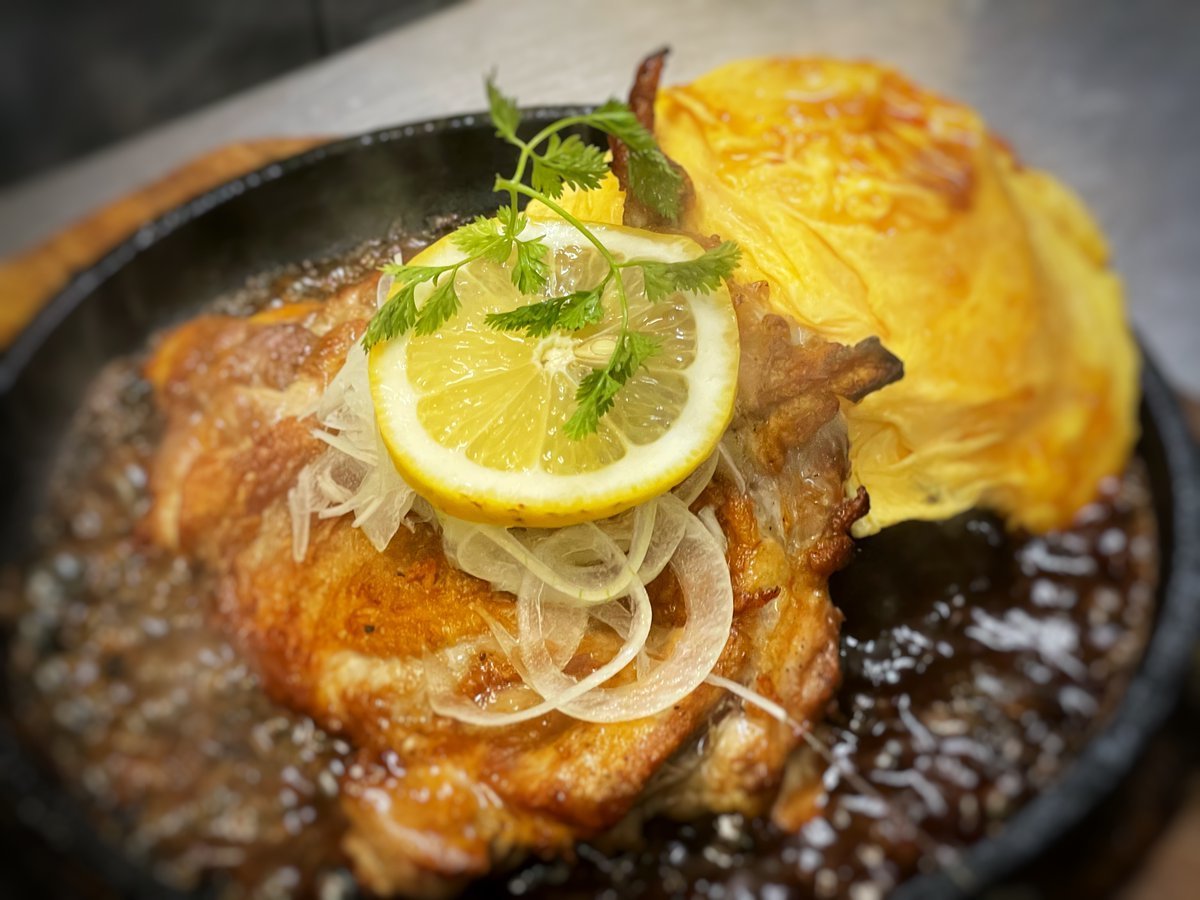 チキンレモンステーキのオムライスはわさだの鉄板オムライス\(//∇//)\