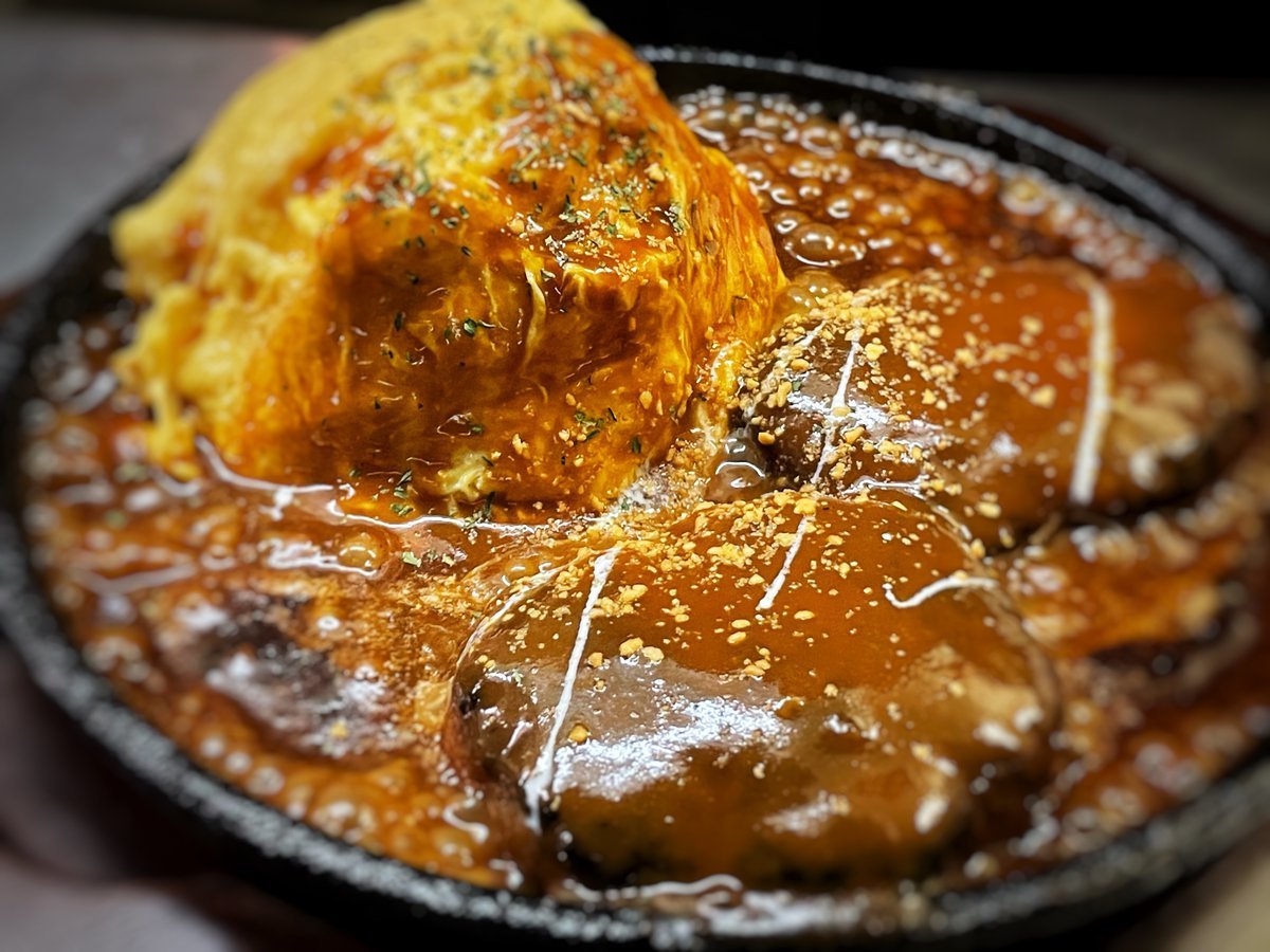 120gのハンバーグが2個!たっぷりデミソースがおいしーわさだの新メニュー!鉄板ハンバーグオムライスです!\(//∇//)\