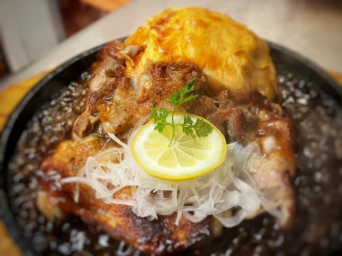 パリッとした皮目がおいしー!チキンレモンステーキのオムライスはわさだの鉄板メニュー\(//∇//)\